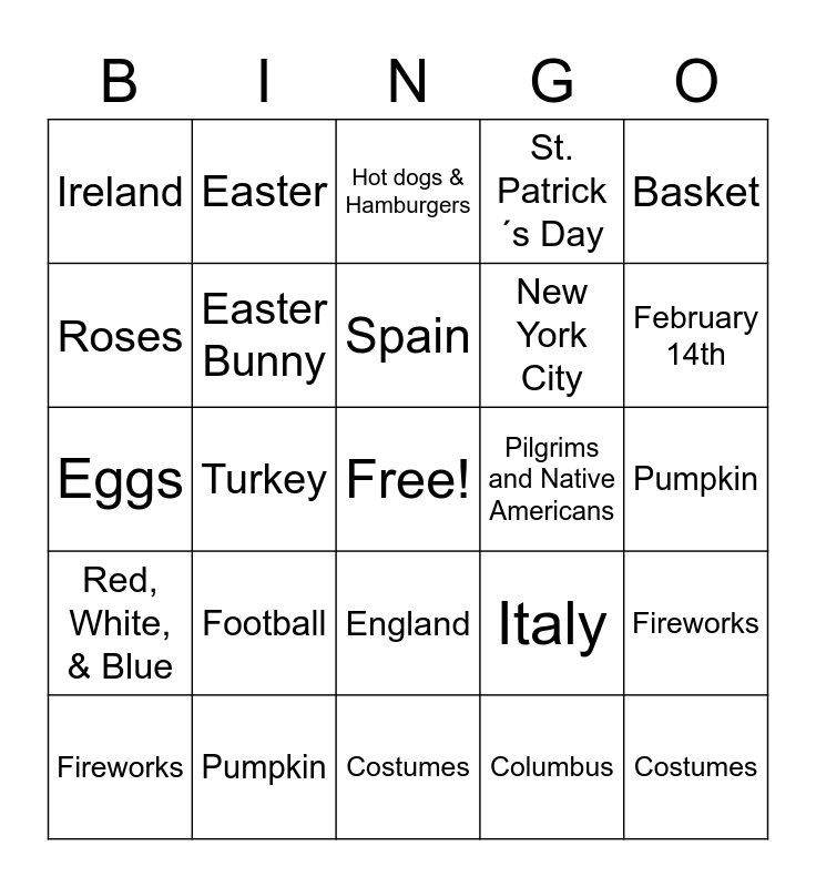 This bingo card has a free space and 24 words: Football, Pumpkin, Spain, Fireworks, Basket, Ireland, Roses, Easter, Pilgrims and Native Americans, England, New York City, Eggs, Italy, Fireworks, Easter Bunny, Columbus, Pumpkin, Hot dogs & Hamburgers, February 14th, Turkey, Costumes, Red, White, & Blue, St. Patrick´s Day and Costumes.