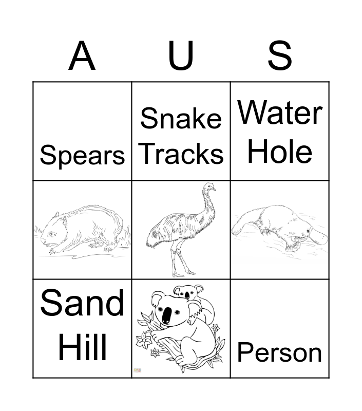 This bingo card has 5 images, a free space and 12 words: Digging Sticks, Water Hole, Spears, People Sitting, Meeting Place, Sand Hill, Campsite, Person, Snake Tracks, Human FootPrint, Shied and Goanna.