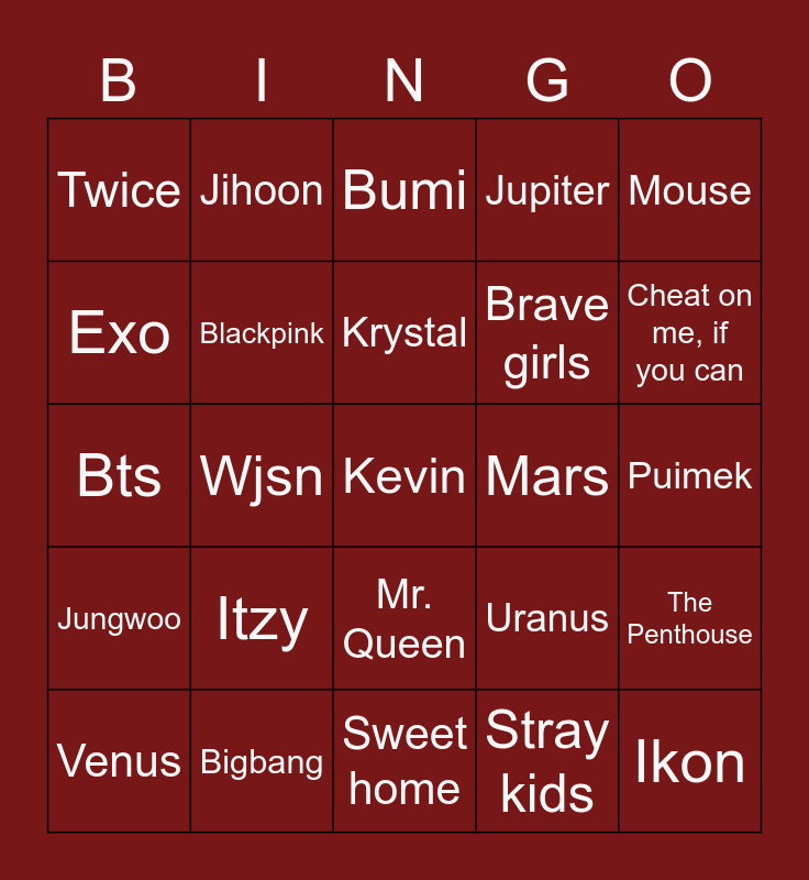 This bingo card has a free space and 24 words: Itzy, Bigbang, Krystal, Venus, Mouse, Twice, Exo, Jihoon, Mars, Mr. Queen, Brave girls, Bts, Uranus, The Penthouse, Blackpink, Stray kids, Puimek, Bumi, Cheat on me, if you can, Wjsn, Ikon, Jungwoo, Jupiter and Sweet home.