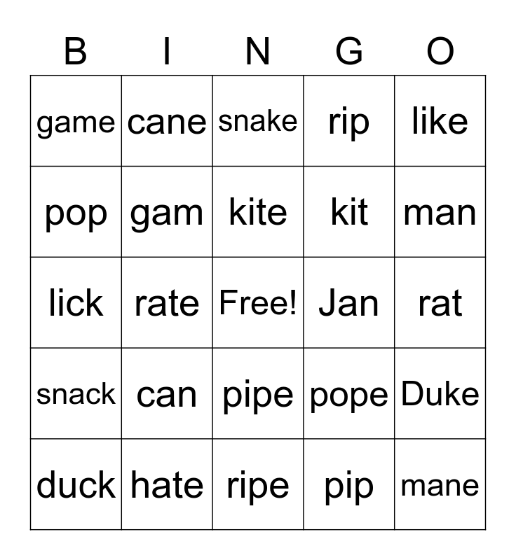 This bingo card has a free space and 24 words: can, hate, kite, duck, like, game, pop, cane, Jan, pipe, kit, lick, pope, Duke, gam, pip, rat, snake, man, rate, mane, snack, rip and ripe.