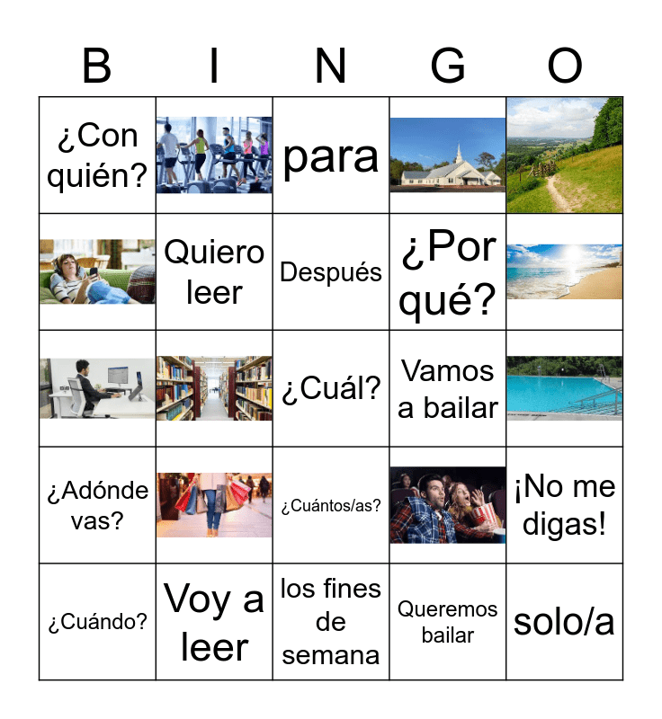 This bingo card has 10 images, a free space and 14 words: Voy a leer, Después, ¿Cuándo?, ¿Con quién?, Vamos a bailar, ¿Cuántos/as?, ¿Por qué?, ¡No me digas!, Quiero leer, Queremos bailar, para, solo/a, ¿Adónde vas? and los fines de semana.