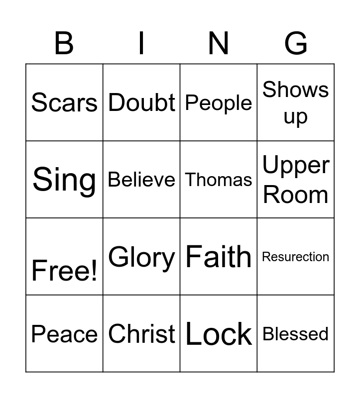 This bingo card has 16 words: Christ, Resurection, People, Scars, Free!, Doubt, Faith, Lock, Sing, Believe, Peace, Shows up, Glory, Upper Room, Thomas and Blessed.