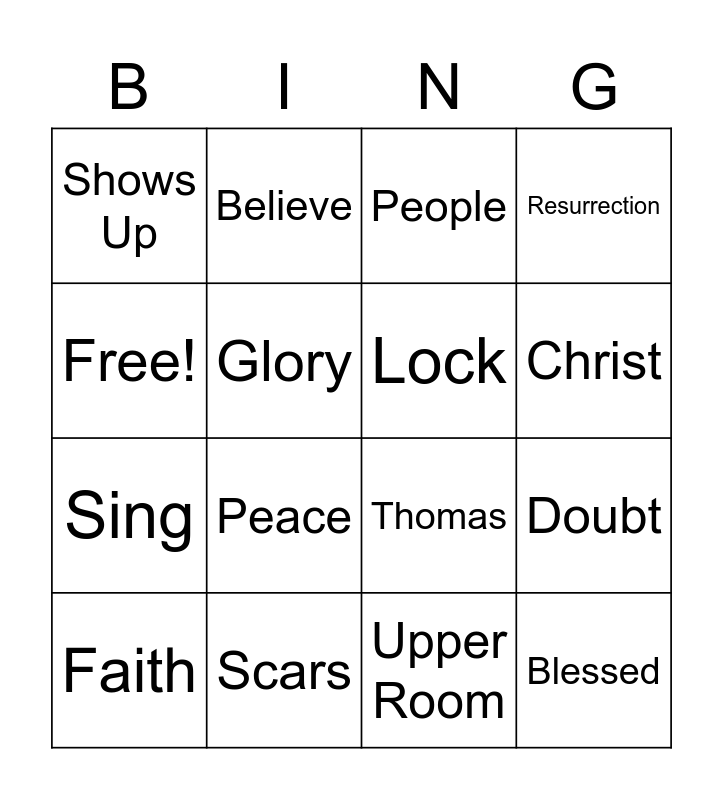 This bingo card has 16 words: Scars, Doubt, People, Shows Up, Sing, Believe, Thomas, Upper Room, Free!, Glory, Faith, Resurrection, Peace, Christ, Lock and Blessed.