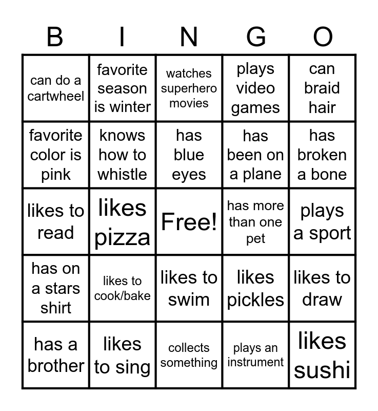 This bingo card has a free space and 24 words: has a brother, likes to cook/bake, has blue eyes, plays an instrument, can braid hair, can do a cartwheel, favorite season is winter, watches superhero movies, has more than one pet, plays a sport, likes to read, knows how to whistle, likes pickles, likes to draw, favorite color is pink, likes to sing, collects something, plays video games, has broken a bone, has on a stars shirt, likes pizza, likes to swim, has been on a plane and likes sushi.