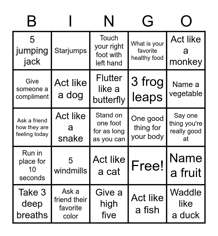 This bingo card has 25 words: 5 windmills, Give a high five, Flutter like a butterfly, Take 3 deep breaths, Act like a monkey, 5 jumping jack, Give someone a compliment, Starjumps, One good thing for your body, Act like a cat, 3 frog leaps, Ask a friend how they are feeling today, Free!, Name a fruit, Act like a dog, Waddle like a duck, Say one thing you're really good at, Touch your right foot with left hand, Name a vegetable, Act like a snake, Stand on one foot for as long as you can, Ask a friend their favorite color, Run in place for 10 seconds, What is your favorite healthy food and Act like a fish.