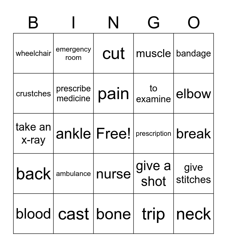 This bingo card has a free space and 24 words: ambulance, cast, pain, blood, bandage, wheelchair, crustches, emergency room, prescription, nurse, to examine, take an x-ray, give a shot, give stitches, prescribe medicine, trip, break, cut, elbow, ankle, neck, back, muscle and bone.