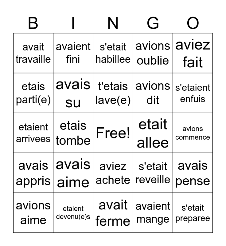 This bingo card has a free space and 24 words: avais aime, etaient devenu(e)s, t'etais lave(e), avions aime, aviez fait, avait travaille, etais parti(e), avaient fini, etait allee, aviez achete, avions dit, etaient arrivees, s'etait reveille, avais pense, avais su, avaient mange, avions commence, s'etait habillee, s'etaient enfuis, etais tombe, s'etait preparee, avais appris, avions oublie and avait ferme.