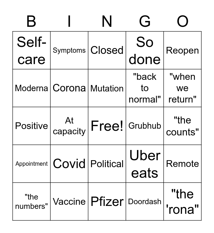 This bingo card has a free space and 24 words: Covid, Vaccine, Mutation, "the numbers", Reopen, Self-care, Moderna, Symptoms, Grubhub, Political, "back to normal", Positive, Uber eats, Remote, Corona, Doordash, "the counts", Closed, "when we return", At capacity, "the 'rona", Appointment, So done and Pfizer.