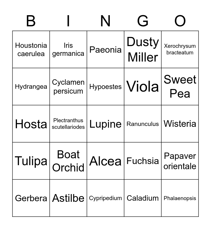 This bingo card has 30 words: Astilbe, Dicentra spectabilis, Plectranthus scutellariodes, Petunia, Houstonia caerulea, Paeonia, Cyclamen persicum, Alcea, Ranunculus, Cypripedium, Wisteria, Lupine, Caladium, Phalaenopsis, Sweet Pea, Epipremnum, Fuchsia, Tulipa, Boat Orchid, Xerochrysum bracteatum, Hosta, Heuchera, Iris germanica, Viola, Hydrangea, Dusty Miller, Papaver orientale, Gerbera, Hypoestes and Peperomia.