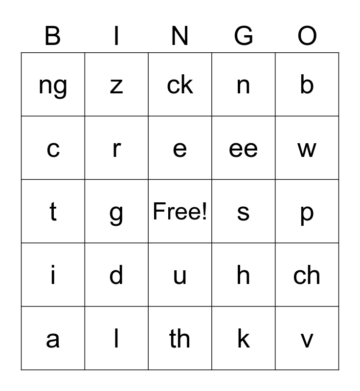 This bingo card has a free space and 28 words: ch, j, ee, k, c, ck, z, i, s, a, t, n, l, th, w, m, d, r, e, u, ng, o, v, g, p, h, b and f.