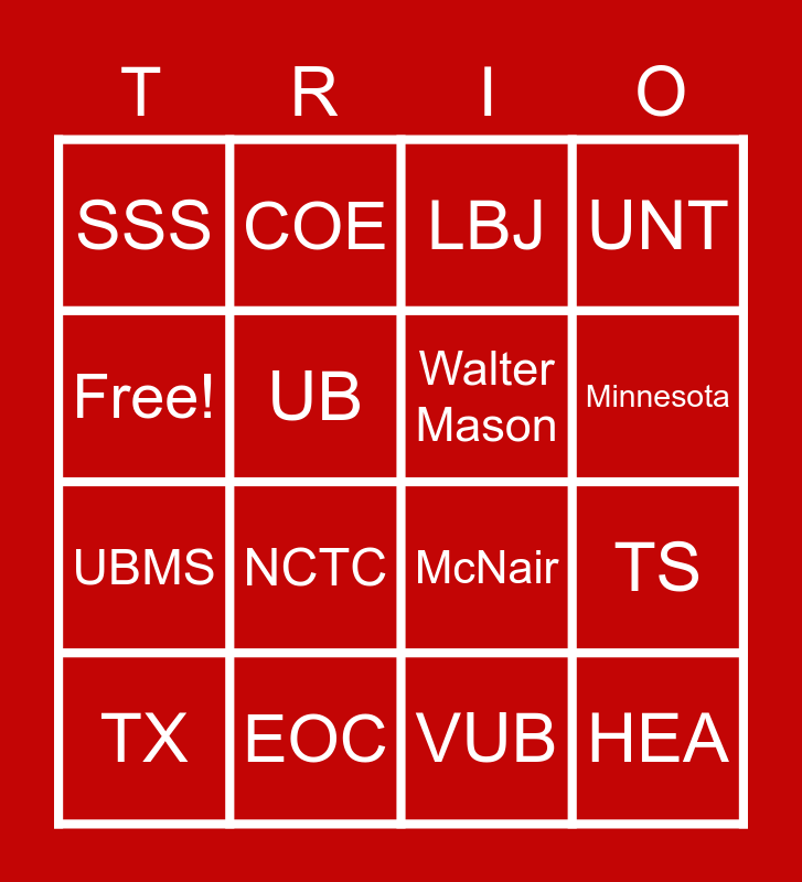 This bingo card has 16 words: EOC, TS, LBJ, SSS, UBMS, COE, McNair, VUB, Free!, UB, TX, UNT, NCTC, Minnesota, Walter Mason and HEA.