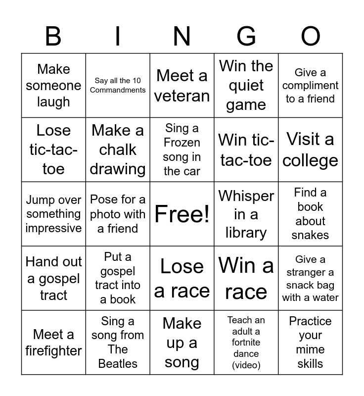 This bingo card has a free space and 33 words: Share the gospel with an adult in your group!, Tell a grown up a memory verse you have learned, Pose for a photo with a friend, Invite someone to the Church Picnic, Hand out a gospel tract, Make a chalk drawing, Give a compliment to a friend, Meet a firefighter, Say all the 10 Commandments, See a police car, Sing a Frozen song in the car, Meet a veteran, Help someone in need, See someone on a bicycle, Whisper in a library, Visit a college, Sing a song from The Beatles, Jump over something impressive, Put a gospel tract into a book, Win a race, Lose a race, Tell a joke, Make someone laugh, Find a book about snakes, Make up a song, Practice your mime skills, Win the quiet game, Win tic-tac-toe, Lose tic-tac-toe, Give a stranger a snack bag with a water, Sing the Doxology, Teach an adult a fortnite dance (video) and Teach an adult to floss (video).