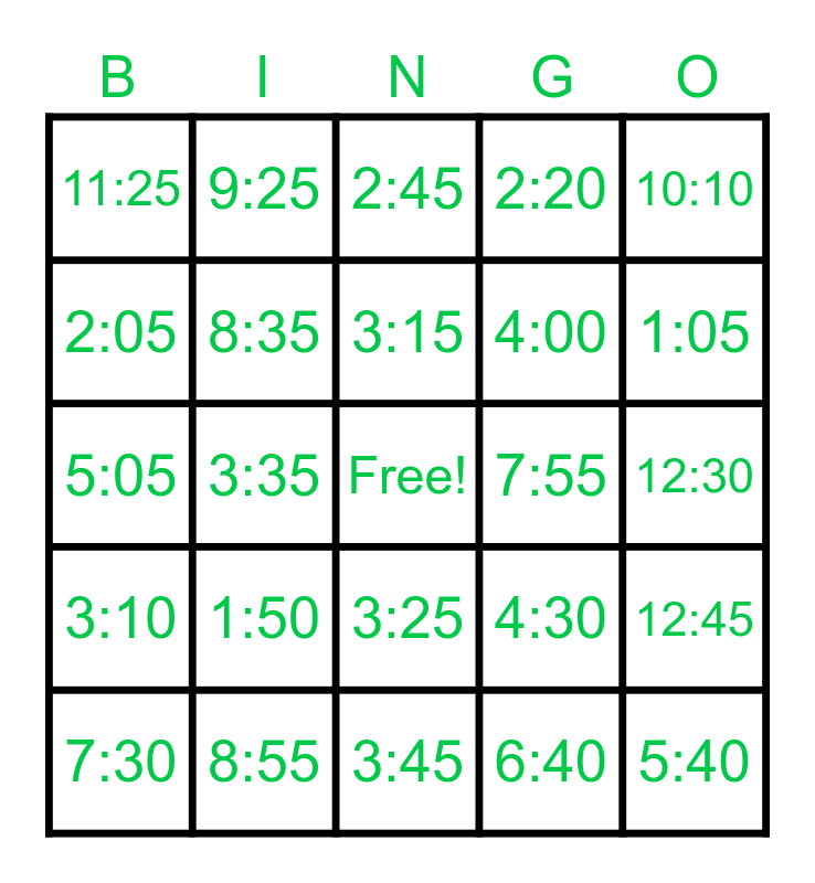 This bingo card has a free space and 24 words: 1:50, 8:55, 3:15, 7:30, 10:10, 11:25, 2:05, 9:25, 7:55, 3:25, 4:00, 5:05, 4:30, 12:45, 8:35, 6:40, 12:30, 2:45, 1:05, 3:35, 5:40, 3:10, 2:20 and 3:45.