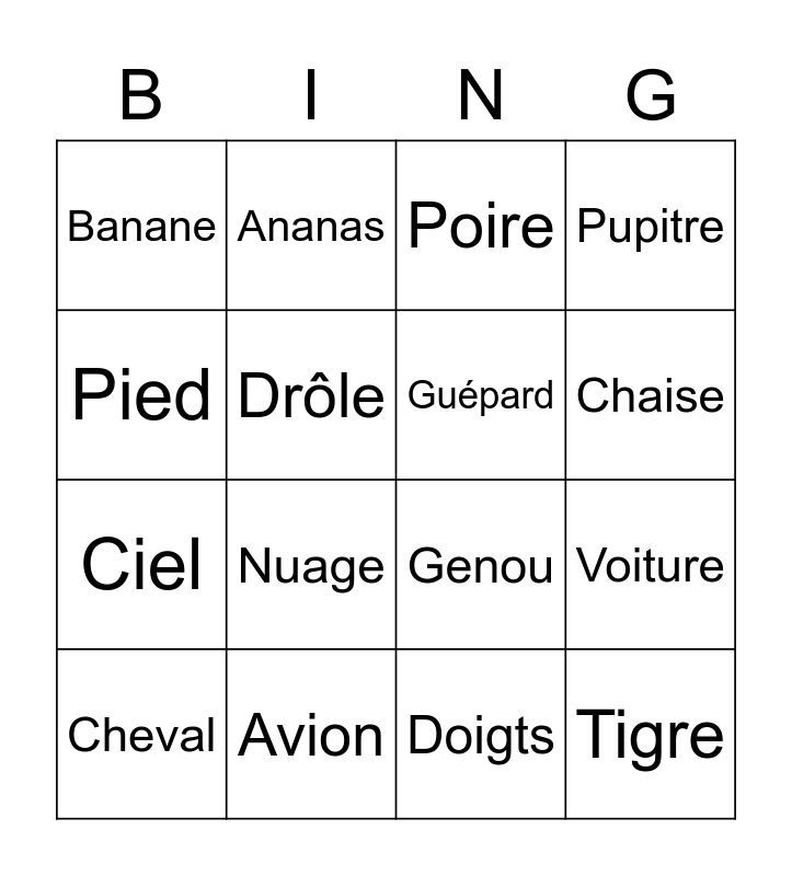 This bingo card has 16 words: Avion, Voiture, Poire, Banane, Ciel, Ananas, Genou, Doigts, Pied, Drôle, Cheval, Pupitre, Nuage, Chaise, Guépard and Tigre.