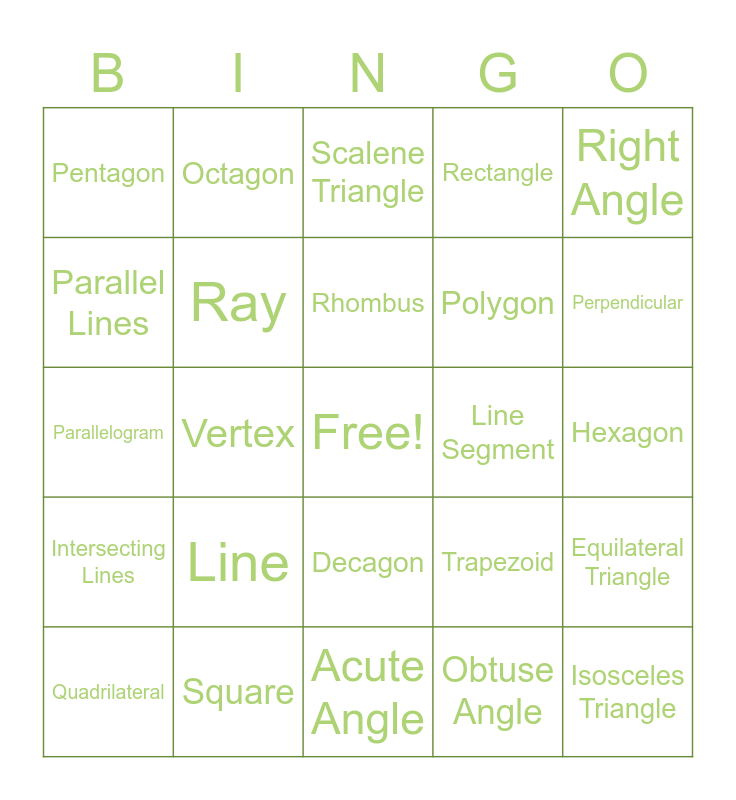 This bingo card has a free space and 24 words: Line, Square, Rhombus, Quadrilateral, Right Angle, Pentagon, Parallel Lines, Octagon, Line Segment, Decagon, Polygon, Parallelogram, Trapezoid, Equilateral Triangle, Ray, Obtuse Angle, Hexagon, Scalene Triangle, Perpendicular, Vertex, Isosceles Triangle, Intersecting Lines, Rectangle and Acute Angle.