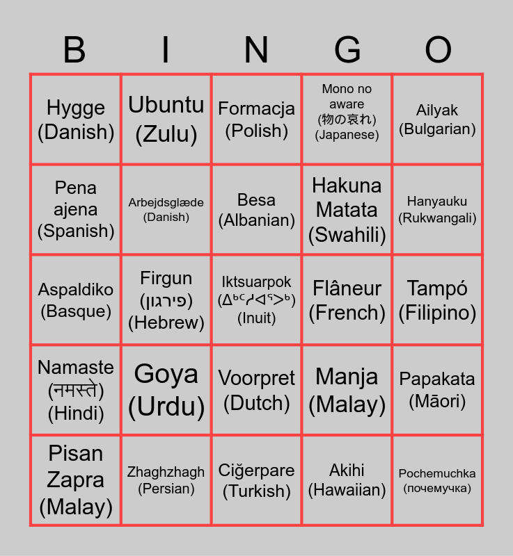 This bingo card has 35 words: Loskop (Afrikaans), Kummerspeckis (German), 加油 (jiā yóu) (Chinese), Arbejdsglæde (Danish), Voorpret (Dutch), Mono no aware (物の哀れ) (Japanese), Pena ajena (Spanish), Ghodar-dim (ঘোড়ার ডিম) (Bengali), Besa (Albanian), Samar (سمر) (Arabic), Aspaldiko (Basque), Ailyak (Bulgarian), Free!, Litost (Czech), Hygge (Danish), Flâneur (French), Akihi (Hawaiian), Firgun (פירגון) (Hebrew), Namaste (नमस्ते) (Hindi), Iktsuarpok (ᐃᒃᑦᓱᐊᕐᐳᒃ) (Inuit), Manja (Malay), Pisan Zapra (Malay), Papakata (Māori), Zhaghzhagh (Persian), Formacja (Polish), Hanyauku (Rukwangali), Pochemuchka (почемучка), Merak (Serbian), Hakuna Matata (Swahili), Tampó (Filipino), Ilunga (Tshiluba), Ciğerpare (Turkish), Goya (Urdu), Ubuntu (Zulu) and Trepverter (Yiddish).