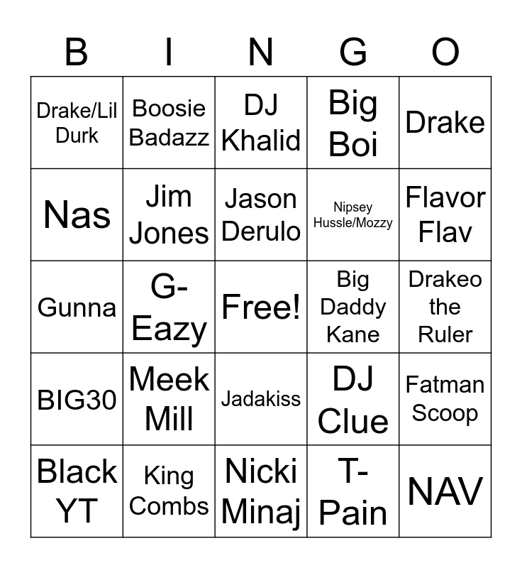This bingo card has a free space and 171 words: Future, Drake, Lil' Baby, Lil Wayne, Drakeo the Ruler, Megan Thee Stallion, Beyoncé, Moneybagg Yo, BIG30, Pooh Shiesty, Chris Brown, Internet Money, Gunna, Don Toliver, NAV, Nipsey Hussle, Jadakiss, Fabolous, YNW Melly, Megan Thee Stallion, Morray, Roddy Ricch, Drake, Giveon, Nipsey Hussle, Pooh Shiesty, Gucci Mane, Young Dolph, Key Glock, Moneybagg Yo, City Girls, DaBaby, Lil Durk, King Von, Young Dolph & Key Glock, Coi Leray, Jay Z, Doja Cat, Tee Grizzley, Lil Durk, Saweetie, Lil Baby, 42 Dugg, Lil Baby/42 Dugg, Cardi B, Only The Family/Lil Durk, Only The Family, BRS Kash, DaBaby, City Girls, Rod Wave, Pacman da Gunman, Nipsey Hussle/Mozzy, Mozzy, Pop Smoke, Lil Baby/DaBaby, Pop Smoke/Lil Baby/DaBaby, Pop Smoke/Lil Baby, Pop Smoke/DaBaby, Pooh Shiesty/BIG30, BIG30, Drake/Lil Durk, Lil Durk, Lil Tjay, 6LACK, Lil Tjay/6LACK, SpotemGottem, SpotemGottem/DaBaby, Fredo Bang, King Combs, Coi Leray, Yung Bleu, Drake, Mooski, Cash Out, Missy Elliot, T-Pain, T.I., DMX, Migos, French Montana, Kendrick Lamar, Big Sean, YG, Remy Ma, The LOX, Lil Kim, Yo Gotti, Boosie Badazz, Birdman, Public Enemy, Kanye West, Jim Jones, DJ Clue, DJ Khalid, Cam'Ron, Dipset, Childish Gambino, Big Boi, Big Daddy Kane, BigDru, Big Pun, Big Punisher, Biz Markie, Black Moon, Blazer Barboza, Black Sheep, Blackstar, Black YT, Bless, Big Sean, Bone Thugs N Harm, Bankrol Hayden, Blueface, Dave East, Danny Brown, Eminem, Erick Sermon, E-dog freeman, EPMD, E-40, Fatman Scoop, Fetty Wap, Flavor Flav, Flight, Flo Rida, Flying Lotus, Foxy Brown, Gunna, Goldlink, Guru, GZA, G Herbo, G-Eazy, Ja Rule, J Cole, Jeremih, Jay Rock, Jason Derulo, Joyner Lucas, Juvenile, Jack Harlow, Lil Yachty, LL Cool J, Meek Mill, Mac Miller, Mulatto, Moneybag Yo, Nas, Nate Dogg, Naughty By Nature, Nelly, Nicki Minaj, NBA Youngboy, Q-Tip, Queen Latifah, Queen Pen, Pusha T, Wale, Schoolboy Q, Snoop Dogg, Swae Lee, The Notorious B.I.G, Tupac, Tyga, Tory Lanez, Vic Mensa, Vince Staples, Wiz Khalifa, YK Osiris and Young M.A..