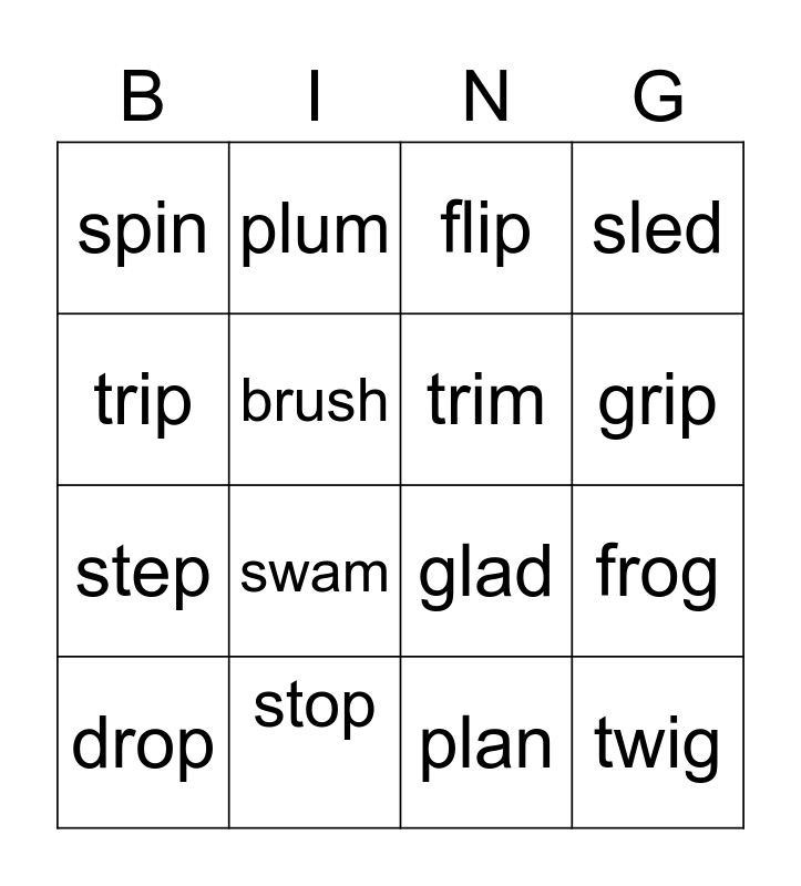 This bingo card has 16 words: stop, frog, flip, spin, step, plum, glad, plan, trip, brush, drop, sled, swam, grip, trim and twig.