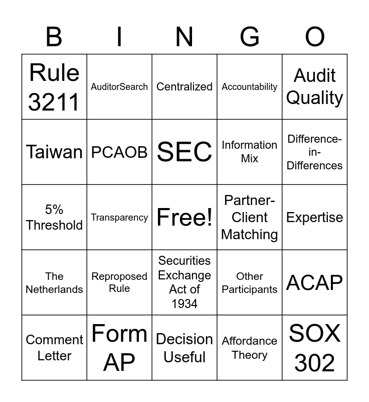 This bingo card has a free space and 38 words: Disclosure, Engagement Partner, 8th Directive, PCAOB, ACAP, Reproposed Rule, SEC, PCAOB Mission, Audit Quality, Information Mix, Transparency, Accountability, SOX 302, Expertise, Taiwan, The Netherlands, Australia, Centralized, Decentralized, Partner-Client Matching, Rule 3211, Form AP, Difference-in-Differences, Comment Letter, Liability, Decision Useful, Reputation, Audit Cost, Rating System, Misunderstanding, Securities Act of 1933, Securities Exchange Act of 1934, Affordance Theory, AuditorSearch, Partner ID, Other Participants, 5% Threshold and Firm ID.