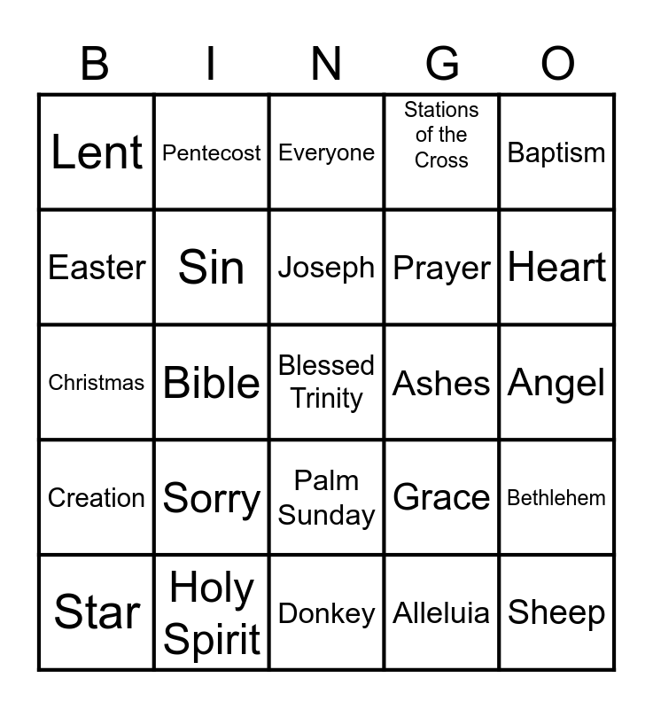 This bingo card has 35 words: Ten Commandments, Tomb, Last Supper, Sin, Palm Sunday, Stations of the Cross, Easter, Snake, Joseph, Mary, Christmas, Baptism, Free!, Candle, Lent, Ashes, Alleluia, Bible, Creation, Blessed Trinity, Grace, Star, Bethlehem, Holy Spirit, Everyone, Heart, Sheep, Altar, Prayer, Angel, Church, Donkey, Sorry, Pentecost and Thomas.