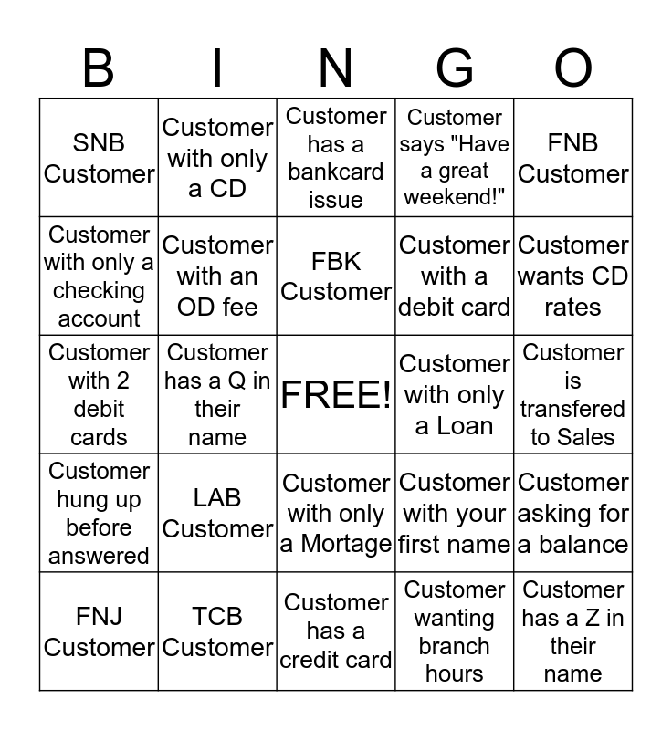 This bingo card has a free space and 24 words: LAB Customer, TCB Customer, FBK Customer, FNJ Customer, FNB Customer, SNB Customer, Customer with only a checking account, Customer with only a CD, Customer with only a Loan, Customer with only a Mortage, Customer with a debit card, Customer with 2 debit cards, Customer with your first name, Customer asking for a balance, Customer with an OD fee, Customer wanting branch hours, Customer is transfered to Sales, Customer has a bankcard issue, Customer wants CD rates, Customer has a Q in their name, Customer has a Z in their name, Customer hung up before answered, Customer says "Have a great weekend!" and Customer has a credit card.