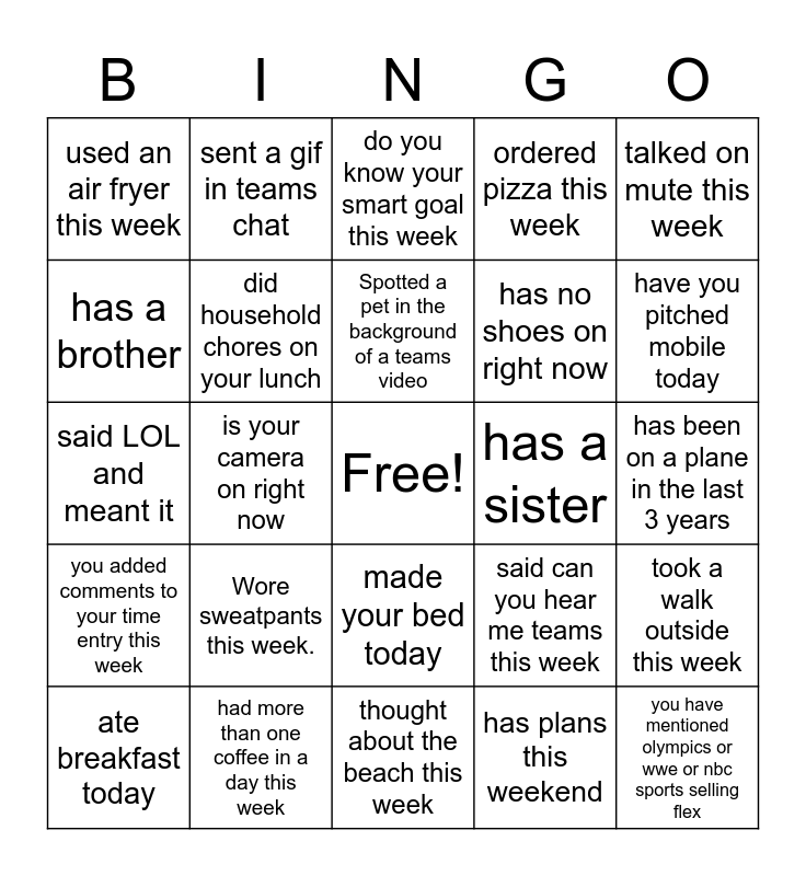 This bingo card has a free space and 24 words: Wore sweatpants this week., had more than one coffee in a day this week, Spotted a pet in the background of a teams video, ate breakfast today, talked on mute this week, used an air fryer this week, has a brother, sent a gif in teams chat, has a sister, made your bed today, has no shoes on right now, said LOL and meant it, said can you hear me teams this week, took a walk outside this week, did household chores on your lunch, has plans this weekend, has been on a plane in the last 3 years, do you know your smart goal this week, have you pitched mobile today, is your camera on right now, you have mentioned olympics or wwe or nbc sports selling flex, you added comments to your time entry this week, ordered pizza this week and thought about the beach this week.