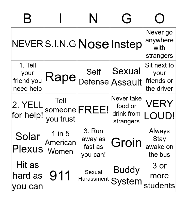 This bingo card has a free space and 24 words: 1 in 5 American Women, 911, Self Defense, Hit as hard as you can, Never go anywhere with strangers, NEVER, 1. Tell your friend you need help, S.I.N.G, Never take food or drink from strangers, 3. Run away as fast as you can!, Sexual Assault, 2. YELL for help!, Groin, Always Stay awake on the bus, Rape, Buddy System, VERY LOUD!, Nose, Sit next to your friends or the driver, Tell someone you trust, 3 or more students, Solar Plexus, Instep and Sexual Harassment.