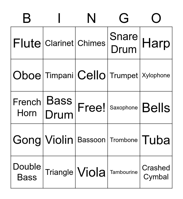 This bingo card has a free space and 25 words: Violin, Viola, Cello, Double Bass, Harp, Flute, Oboe, Clarinet, Saxophone, Bassoon, Trumpet, French Horn, Trombone, Tuba, Timpani, Marimba, Bells, Chimes, Xylophone, Bass Drum, Crashed Cymbal, Triangle, Gong, Snare Drum and Tambourine.