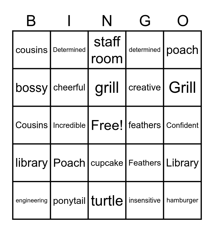 This bingo card has a free space and 62 words: slim, ponytail, music room, library, swimming pool, generous, cheerful, caring, creative, confident, determined, hardworking, bossy, incredible, husband, cousins, hamburger, poach, steam, grill, feathers, staff room, engineering, insensitive, university, Slim, Ponytail, Music room, Library, Swimming pool, Generous, Cheerful, Caring, Creative, Confident, Determined, Hardworking, Bossy, Incredible, Husband, Cousins, Hamburger, Poach, Steam, Grill, Feathers, Staff room, Engineering, Insensitive, University, cupcake, turtle, selfless, athletic, round, cookery room, tuck shop, science, astronomy club, geography, talkative and energetic.