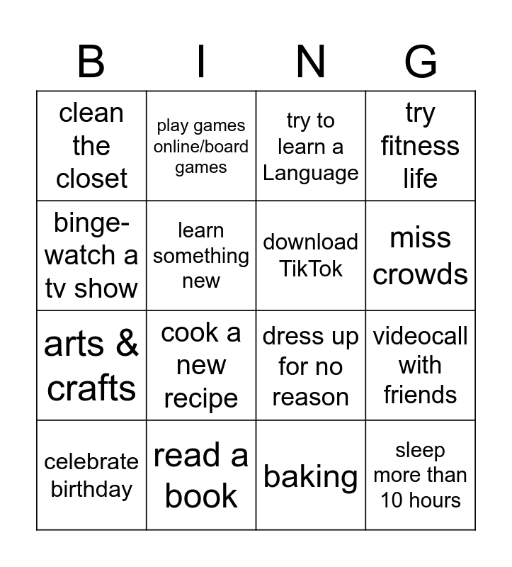 This bingo card has 16 words: read a book, videocall with friends, try to learn a Language, clean the closet, arts & crafts, play games online/board games, dress up for no reason, baking, binge-watch a tv show, learn something new, celebrate birthday, try fitness life, cook a new recipe, miss crowds, download TikTok and sleep more than 10 hours.