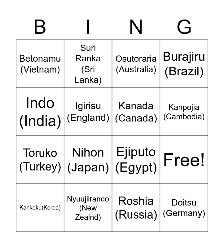 This bingo card has 20 words: Free!, Amerika (USA/アメリカ), Osutoraria (Australia), Chuugoku (China), Kankoku(Korea), Indo (India), Nyuujiirando (New Zealnd), Betonamu (Vietnam), Toruko (Turkey), Suri Ranka (Sri Lanka), Nihon (Japan), Ejiputo (Egypt), Igirisu (England), Doitsu (Germany), Kanada (Canada), Chiri (Chile), Kanpojia (Cambodia), Burajiru (Brazil), Roshia (Russia) and Shingaporu (Singapore).