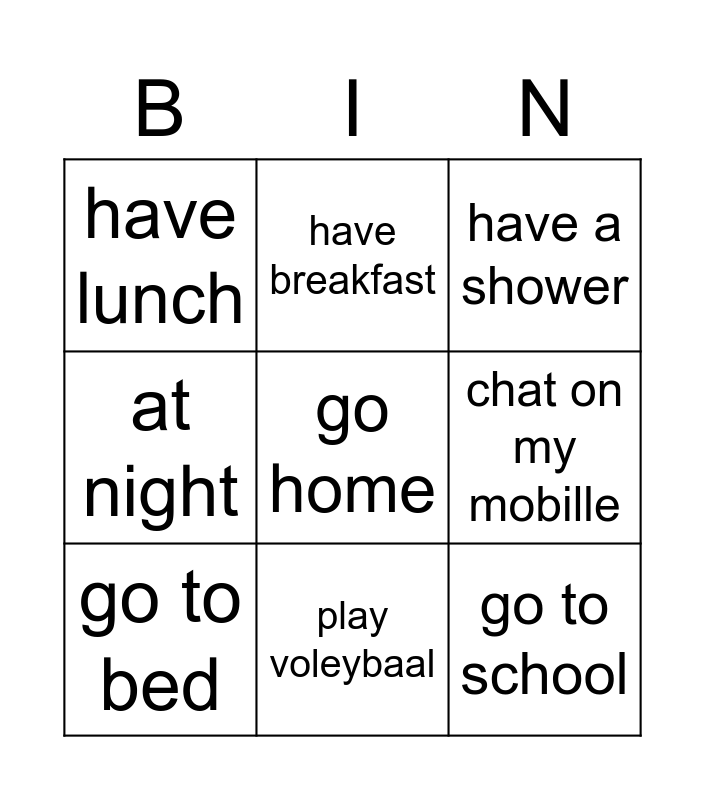 This bingo card has a free space and 8 words: chat on my mobille, have a shower, have breakfast, go to bed, have lunch, go to school, at night and play voleybaal.