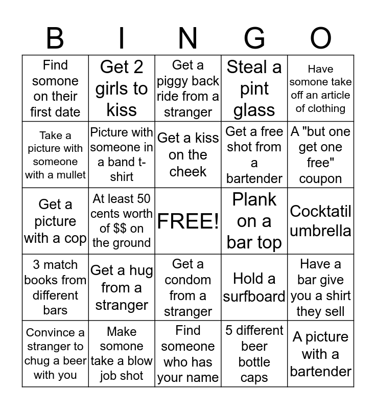 This bingo card has a free space and 24 words: Get a hug from a stranger, Make somone take a blow job shot, Get a kiss on the cheek, Convince a stranger to chug a beer with you, Have somone take off an article of clothing, Find somone on their first date, Take a picture with someone with a mullet, Get 2 girls to kiss, Plank on a bar top, Get a condom from a stranger, Get a free shot from a bartender, Get a picture with a cop, Hold a surfboard, Have a bar give you a shirt they sell, Picture with someone in a band t-shirt, 5 different beer bottle caps, Cocktatil umbrella, Get a piggy back ride from a stranger, A "but one get one free" coupon, At least 50 cents worth of $$ on the ground, A picture with a bartender, 3 match books from different bars, Steal a pint glass and Find someone who has your name.