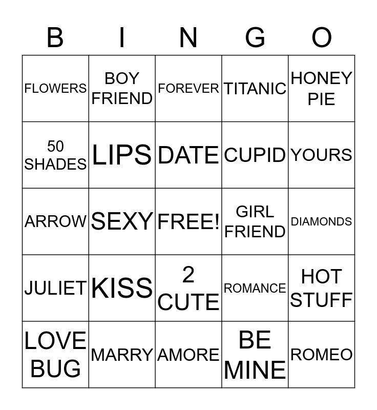 This bingo card has a free space and 24 words: KISS, MARRY, DATE, LOVE BUG, HONEY PIE, FLOWERS, 50 SHADES, BOY FRIEND, GIRL FRIEND, 2 CUTE, CUPID, ARROW, ROMANCE, HOT STUFF, LIPS, BE MINE, DIAMONDS, FOREVER, YOURS, SEXY, ROMEO, JULIET, TITANIC and AMORE.
