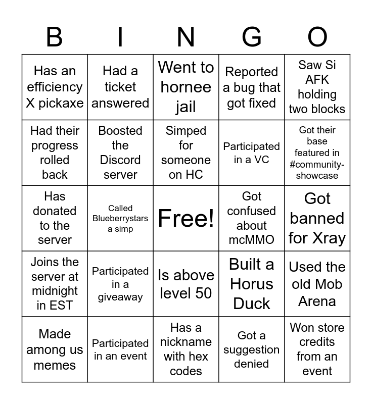 This bingo card has a free space and 24 words: Participated in a giveaway, Participated in an event, Simped for someone on HC, Made among us memes, Saw Si AFK holding two blocks, Has an efficiency X pickaxe, Had their progress rolled back, Had a ticket answered, Got confused about mcMMO, Is above level 50, Participated in a VC, Has donated to the server, Built a Horus Duck, Used the old Mob Arena, Boosted the Discord server, Got a suggestion denied, Got banned for Xray, Went to hornee jail, Got their base featured in #community-showcase, Called Blueberrystars a simp, Won store credits from an event, Joins the server at midnight in EST, Reported a bug that got fixed and Has a nickname with hex codes.