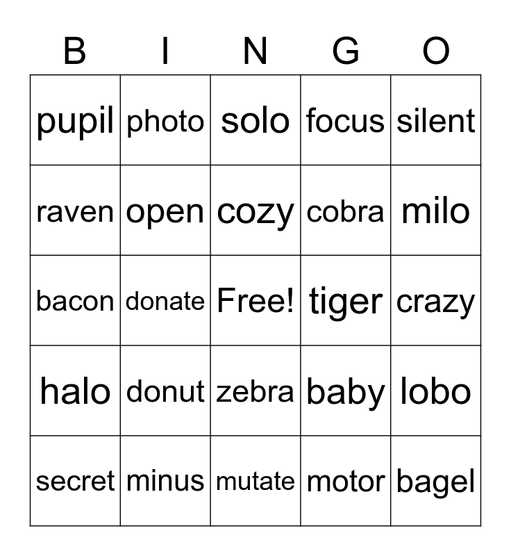 This bingo card has a free space and 24 words: donut, minus, cozy, secret, silent, pupil, raven, photo, tiger, zebra, cobra, bacon, baby, lobo, open, motor, crazy, solo, milo, donate, bagel, halo, focus and mutate.
