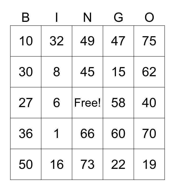 This bingo card has a free space and 24 words: 1, 16, 45, 50, 75, 10, 30, 32, 58, 66, 15, 27, 60, 70, 8, 22, 40, 49, 62, 6, 19, 36, 47 and 73.