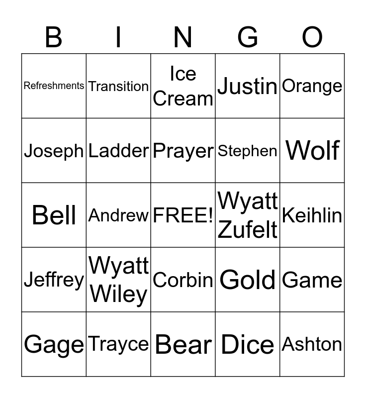 This bingo card has a free space and 40 words: Spencer, Bell, Cub Scout, Ladder, Trayce, Corbin, Prayer, Rank, Orange, Jeffrey, Andrew, Justin, Ashton, Keihlin, Wyatt Zufelt, Wyatt Wiley, Flag Ceremony, Refreshments, Root Beer, Ice Cream, Game, Dice, Stephen, Joseph, Marstan, Fisher, Kevin, Kenyon, Carson, Jackson Aguirre, Jaxon Torsell, Gage, Blue, Gold, Wolf, Bear, Bobcat, Webelos, Transition and Arrow Point.