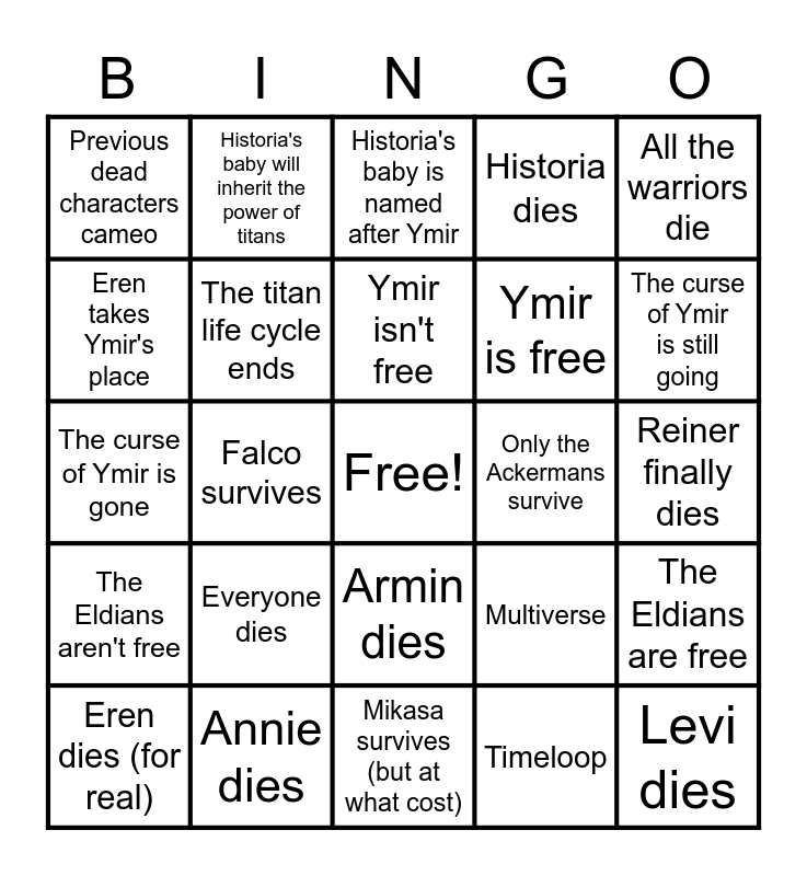 This bingo card has a free space and 24 words: Everyone dies, Annie dies, Ymir isn't free, Eren dies (for real), All the warriors die, Previous dead characters cameo, Eren takes Ymir's place, Historia's baby will inherit the power of titans, Only the Ackermans survive, Armin dies, Ymir is free, The curse of Ymir is gone, Multiverse, The Eldians are free, The titan life cycle ends, Timeloop, Reiner finally dies, Historia's baby is named after Ymir, The curse of Ymir is still going, Falco survives, Levi dies, The Eldians aren't free, Historia dies and Mikasa survives (but at what cost).