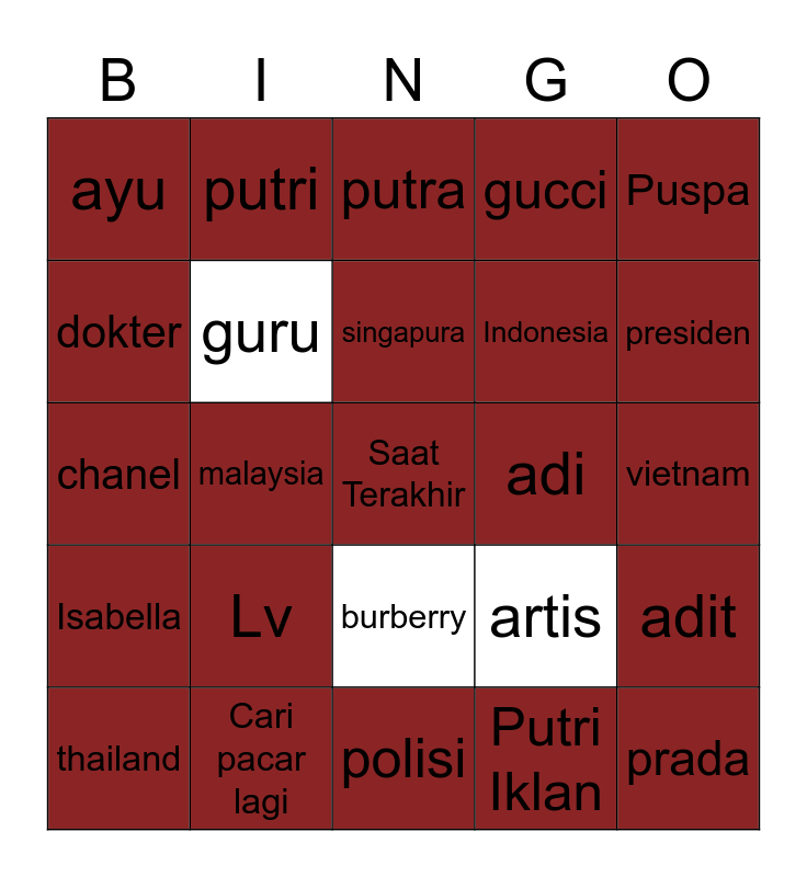 This bingo card has 25 words: Isabella, Cari pacar lagi, Saat Terakhir, Putri Iklan, Puspa, ayu, putri, putra, adi, adit, dokter, guru, polisi, artis, presiden, thailand, malaysia, singapura, Indonesia, vietnam, chanel, Lv, burberry, gucci and prada.