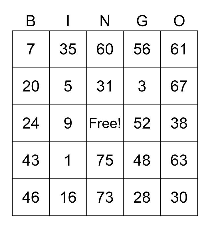 This bingo card has a free space and 24 words: 1, 16, 31, 46, 61, 7, 20, 35, 52, 75, 3, 24, 48, 63, 5, 28, 38, 60, 67, 9, 30, 43, 56 and 73.