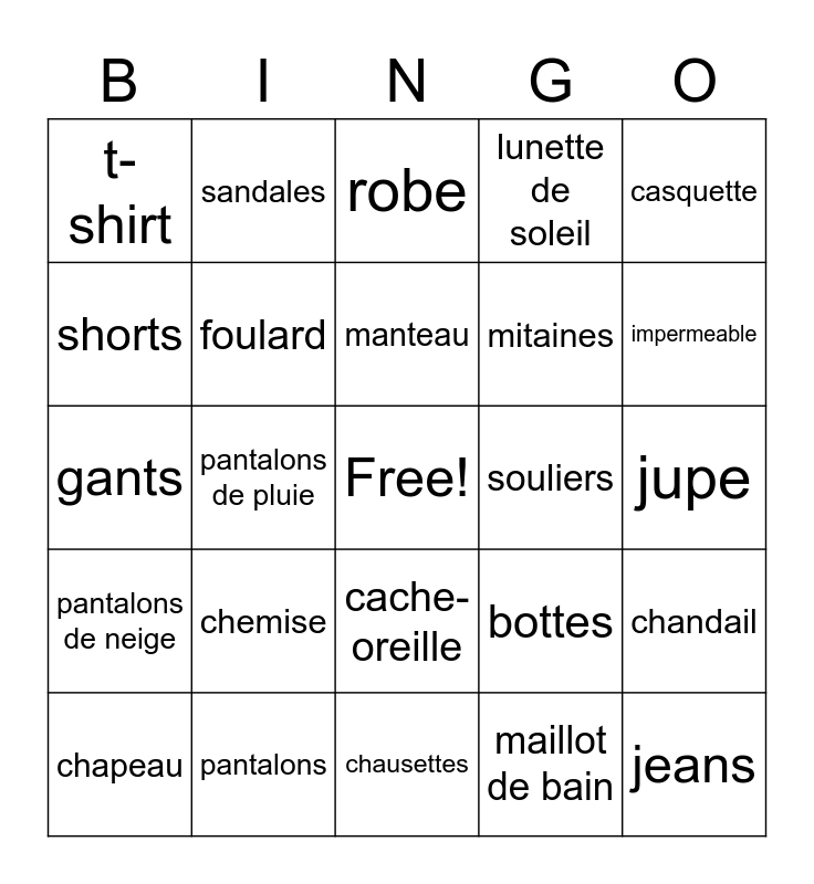 This bingo card has a free space and 24 words: chemise, pantalons, manteau, chapeau, casquette, t-shirt, shorts, sandales, souliers, cache-oreille, mitaines, gants, bottes, chandail, foulard, maillot de bain, jupe, robe, impermeable, pantalons de pluie, jeans, pantalons de neige, lunette de soleil and chausettes.