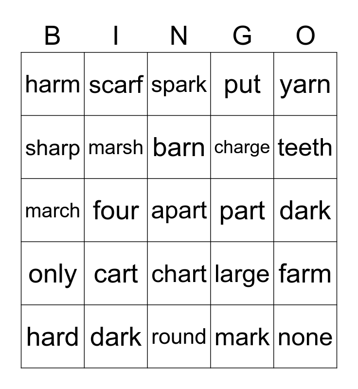 This bingo card has a free space and 24 words: cart, dark, barn, hard, yarn, harm, sharp, scarf, part, chart, charge, march, large, farm, marsh, mark, dark, spark, teeth, four, none, only, put and round.