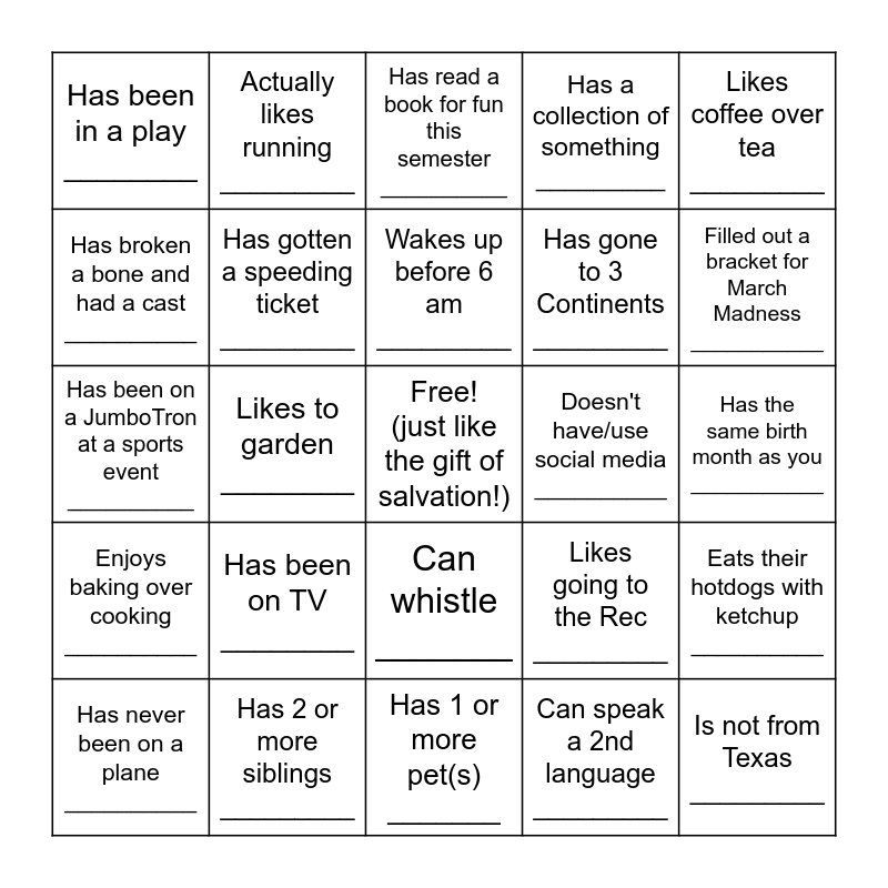 This bingo card has a free space and 24 words: Has been on TV ________, Has 2 or more siblings _________, Wakes up before 6 am _________, Has never been on a plane __________, Likes coffee over tea _________, Has been in a play ________, Has broken a bone and had a cast __________, Actually likes running _________, Doesn't have/use social media __________, Can whistle _______, Has gone to 3 Continents _________, Has been on a JumboTron at a sports event __________, Likes going to the Rec _________, Eats their hotdogs with ketchup __________, Has gotten a speeding ticket _________, Can speak a 2nd language _________, Has the same birth month as you ___________, Has read a book for fun this semester __________, Filled out a bracket for March Madness ___________, Likes to garden ________, Is not from Texas _________, Enjoys baking over cooking __________, Has a collection of something _________ and Has 1 or more pet(s) _______.