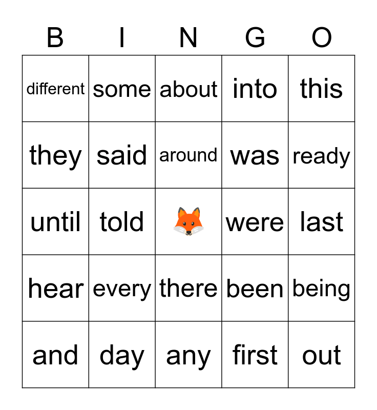 This bingo card has a free space and 24 words: every, day, around, and, this, different, they, some, were, there, was, until, been, being, said, first, last, about, ready, told, out, hear, into and any.