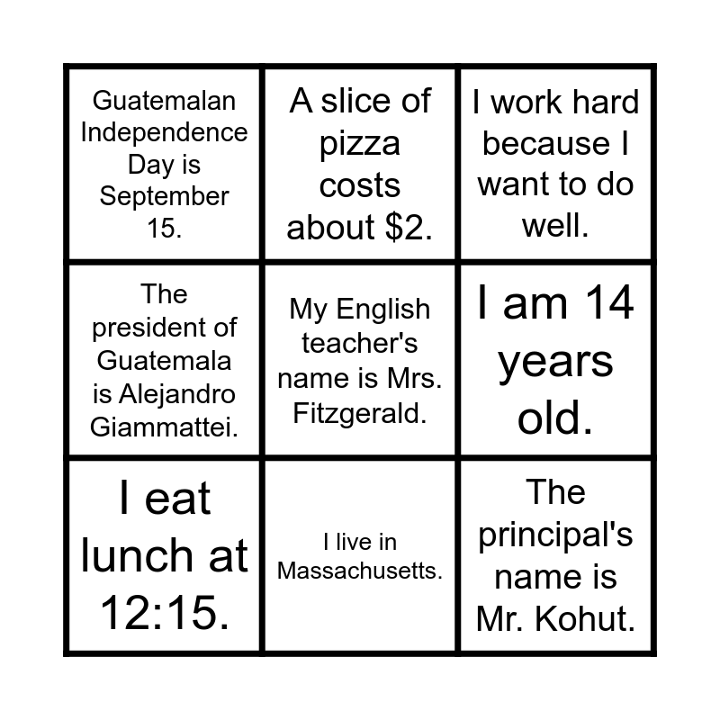 This bingo card has 11 words: The principal's name is Mr. Kohut., I live in Massachusetts., My English teacher's name is Mrs. Fitzgerald., I eat lunch at 12:15., A slice of pizza costs about $2., I work hard because I want to do well., I am 14 years old., The capital of Guatemala is la ciudad de Guatemala., The president of Guatemala is Alejandro Giammattei., Guatemalan Independence Day is September 15. and The U.S. president lives in the White House..