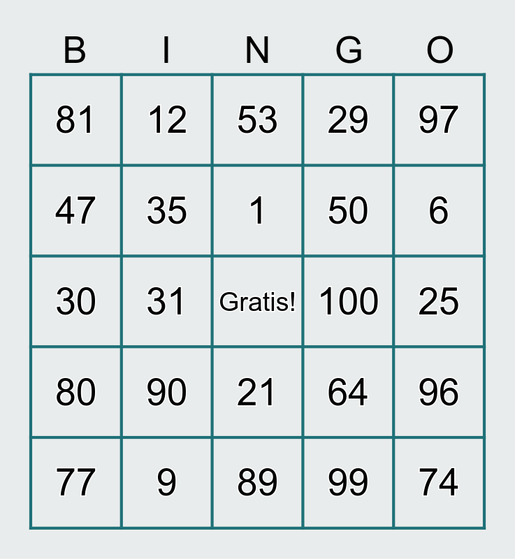 This bingo card has a free space and 24 words: 77, 90, 1, 99, 97, 81, 12, 53, 100, 25, 30, 35, 64, 96, 47, 9, 89, 29, 6, 80, 31, 21, 50 and 74.