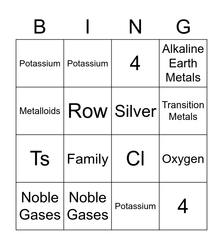 This bingo card has 49 words: Free!, Noble Gases, 3, Metalloids, Oxygen, Nitrogen, Potassium, Ts, Row, Family, Silver, Alkaline Earth Metals, Cl, 4, Element, Compound, Transition Metals, Noble Gases, 3, Metalloids, Oxygen, Nitrogen, Potassium, Ts, Row, Family, Silver, Alkaline Earth Metals, Cl, 4, Element, Compound, Transition Metals, Noble Gases, 3, Metalloids, Oxygen, Nitrogen, Potassium, Ts, Row, Family, Silver, Alkaline Earth Metals, Cl, 4, Element, Compound and Transition Metals.