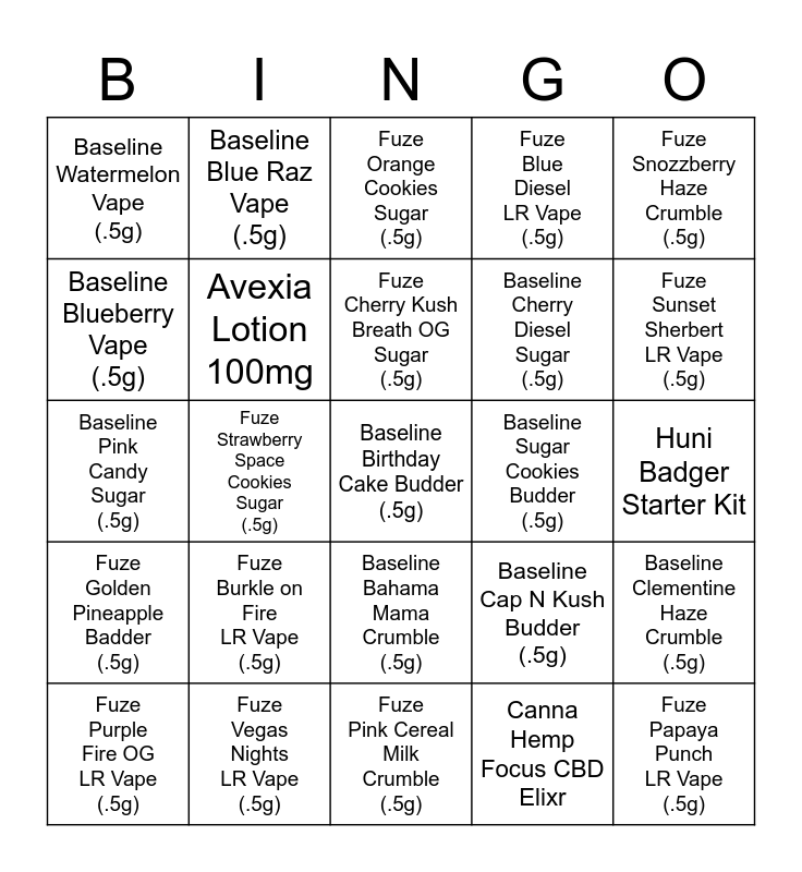This bingo card has a free space and 24 words: Fuze Burkle on Fire LR Vape (.5g), Fuze Vegas Nights LR Vape (.5g), Fuze Cherry Kush Breath OG Sugar (.5g), Fuze Purple Fire OG LR Vape (.5g), Fuze Snozzberry Haze Crumble (.5g), Baseline Watermelon Vape (.5g), Baseline Blueberry Vape (.5g), Baseline Blue Raz Vape (.5g), Baseline Sugar Cookies Budder (.5g), Baseline Bahama Mama Crumble (.5g), Baseline Cherry Diesel Sugar (.5g), Baseline Pink Candy Sugar (.5g), Baseline Cap N Kush Budder (.5g), Baseline Clementine Haze Crumble (.5g), Avexia Lotion 100mg, Canna Hemp Focus CBD Elixr, Huni Badger Starter Kit, Fuze Orange Cookies Sugar (.5g), Fuze Sunset Sherbert LR Vape (.5g), Fuze Strawberry Space Cookies Sugar (.5g), Fuze Papaya Punch LR Vape (.5g), Fuze Golden Pineapple Badder (.5g), Fuze Blue Diesel LR Vape (.5g) and Fuze Pink Cereal Milk Crumble (.5g).