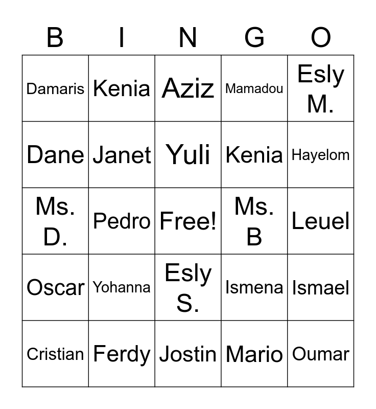 This bingo card has a free space and 24 words: Yohanna, Ferdy, Yuli, Cristian, Esly M., Damaris, Dane, Kenia, Ms. B, Esly S., Kenia, Ms. D., Ismena, Ismael, Janet, Mario, Leuel, Aziz, Hayelom, Pedro, Oumar, Oscar, Mamadou and Jostin.